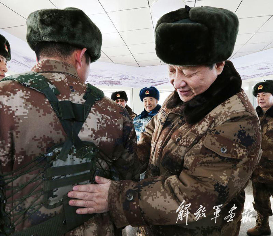 1月26日,习近平在内蒙古军区边防某团三角山哨所仔细察看下士张伟的执勤装具。