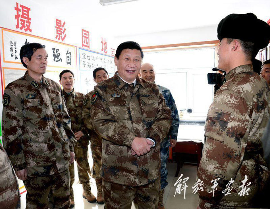 1月26日,习近平在内蒙古军区边防某团一连文化活动室,询问连队文化活动开展情况。
