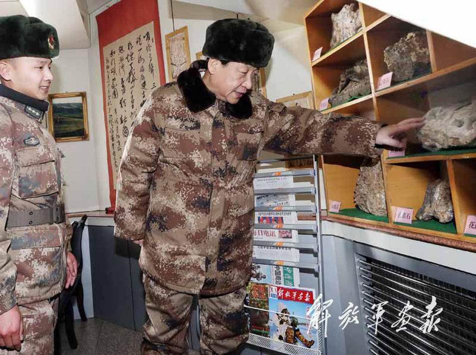 1月26日,习近平视察内蒙古军区边防某团一连文化学习设施。