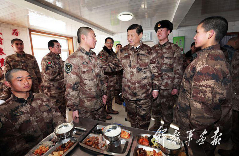 1月26日,习近平同内蒙古军区边防某团一连官兵在连队食堂共进午餐。习主席在食堂与新战士亲切交谈。