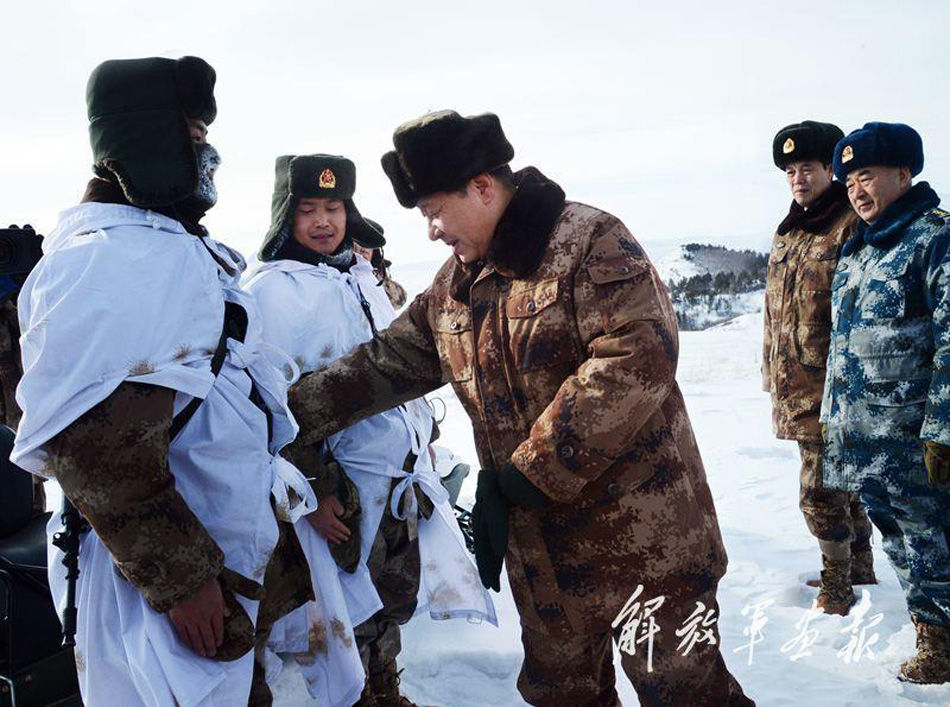 1月26日上午,习近平与内蒙古军区边防某团一连摩托雪橇巡逻队的战士们亲切交谈,关切地询问下士刘艳杰衣服是否保暖。