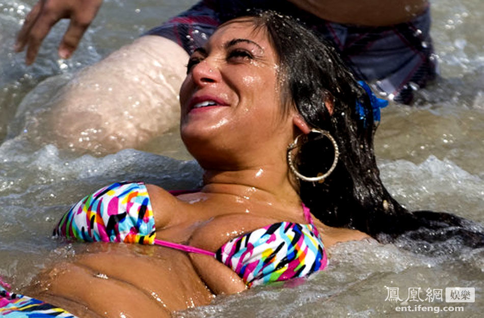 当地时间2011年7月2日,纽约,真人秀节目《泽西海岸》(Jersey Shore)录制现场。女星Deena在水中更被众多猛男托举起来。
