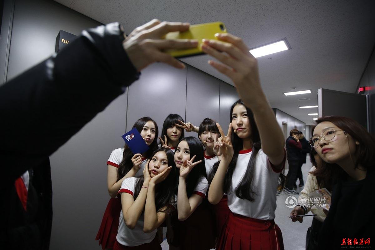 表演完后,Gfriend成员们摆出可爱的表情自拍。