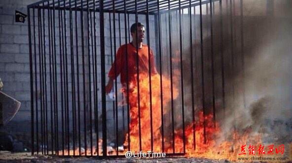 【直报网2月4日讯】(新浪图片)2月3日报道,日前被IS绑架的约旦空军中尉飞行员莫亚兹•卡萨斯贝,在近日流出的一段视频中显示他被IS执行了火刑。在视频中,他被装在金属笼子里,橘色囚服上浸湿可燃液体。然后IS成员在外部开始被引燃,渐渐燃烧到笼子里,最终视频显示卡萨斯贝被活活烧死的场景。 |