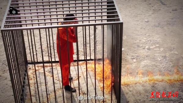 火从外部被引燃进笼子,接下来的场景里,他被火活活烧死。