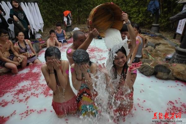 【直报网2月16日讯】(新华网)不管在哪,情人节都是甜蜜的,各地情人节也都融入了一些当地的传统。但如今情人节也越来越商业了。广东一景区举办情侣喝奶大赛,山西小伙人民币铺鹊桥相亲。 【情侣喝奶大赛】2月14日,广东佛冈县一景区上演情侣“喝奶大比拼”,十多对情侣同喝一桶奶、共泡一池花,过了一把任性的情人节。 【情侣喝奶大赛】据悉,主办方招募了来自东莞、广州、清远等地数十对情侣报名参加,在一个“心”型温泉池中,放入了近万朵新鲜玫瑰和山茶花,并现场注入近一吨生鲜牛奶,营造出一个甜美而浪漫的“鲜奶香花池”;参赛的情侣们人手一杯1.8斤容量大杯牛奶,以手交杯的形式开展喝奶比赛,以男女双方都喝完整杯牛奶的速度,即时间长短来进行排名。▲ |