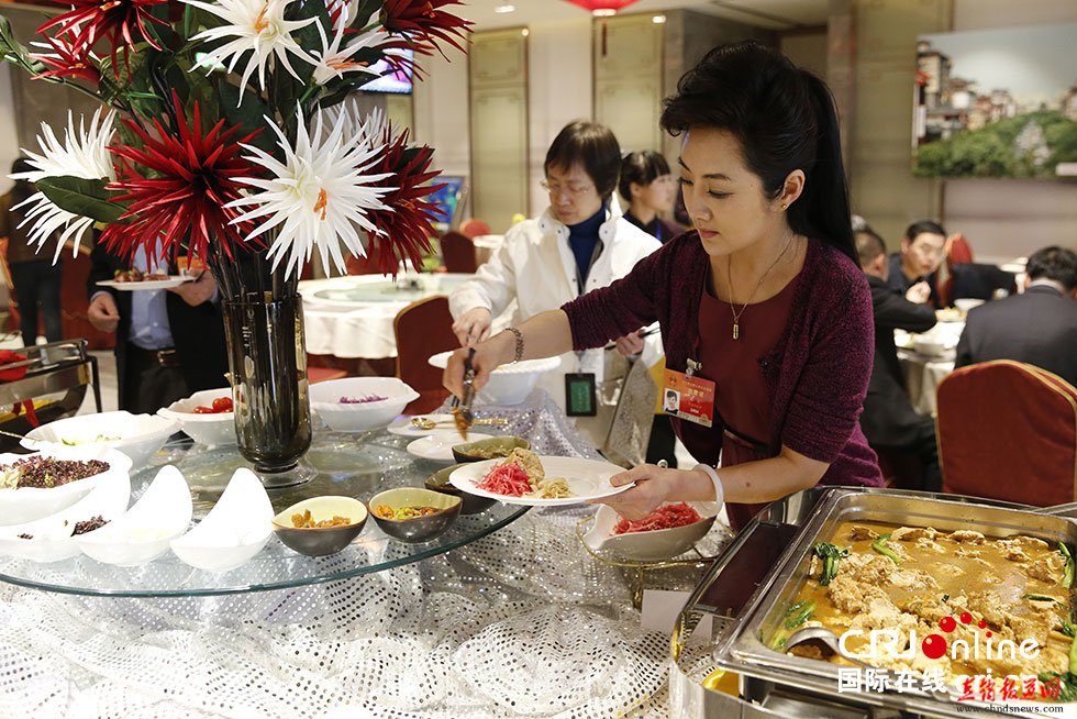 中午孙维和其他陕西团代表来到驻地的餐厅就餐。孙维说她一般午饭和晚饭只吃些水果和不是特别油腻的素菜,能保养的这么好,坚持吃素可能是原因之一。