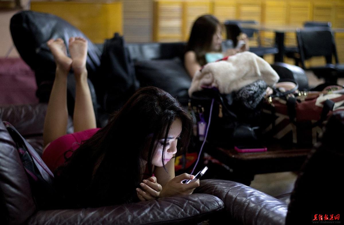 训练间隙,一名参加训练的女孩趴在沙发上休息。