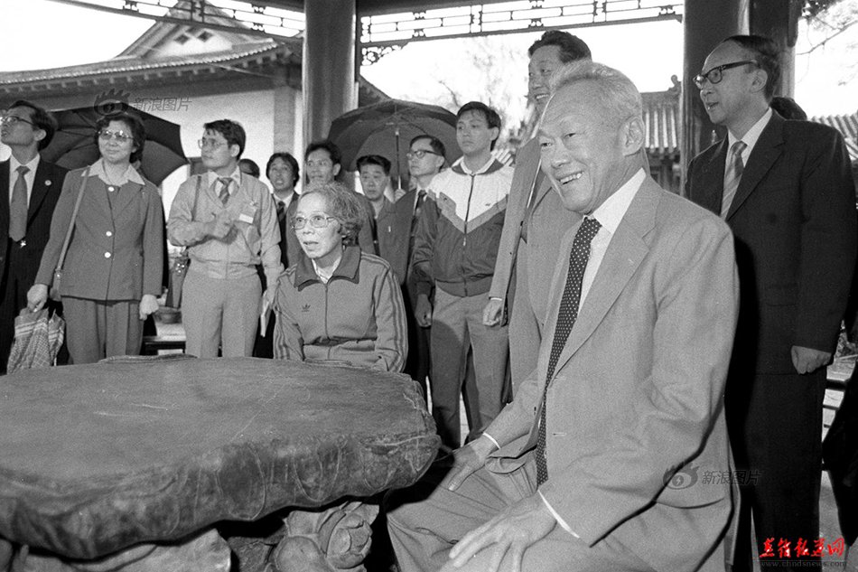 李光耀支持一个中国政策,支持海峡两岸统一。在他的支持下,1993年第一次汪辜会谈在新加坡举行。两岸关系迈出了历史性的重要一步。图为1985年9月14日,新加坡总理李光耀和夫人一行游览济南名胜大明湖。摄影:时盘棋/新华社