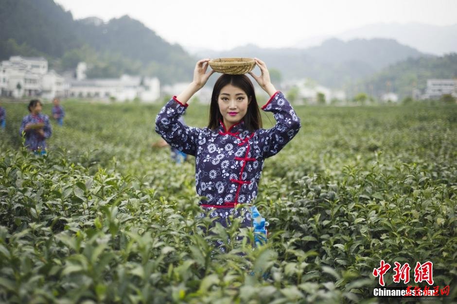 【直报网4月29日讯】(中国新闻网)4月27日,模特们变身“采茶女”在湖南沩山温泉百亩茶园与村民们体验采茶,并身着旗袍在园内进行了一场唯美的田间走秀。 杨华峰 摄