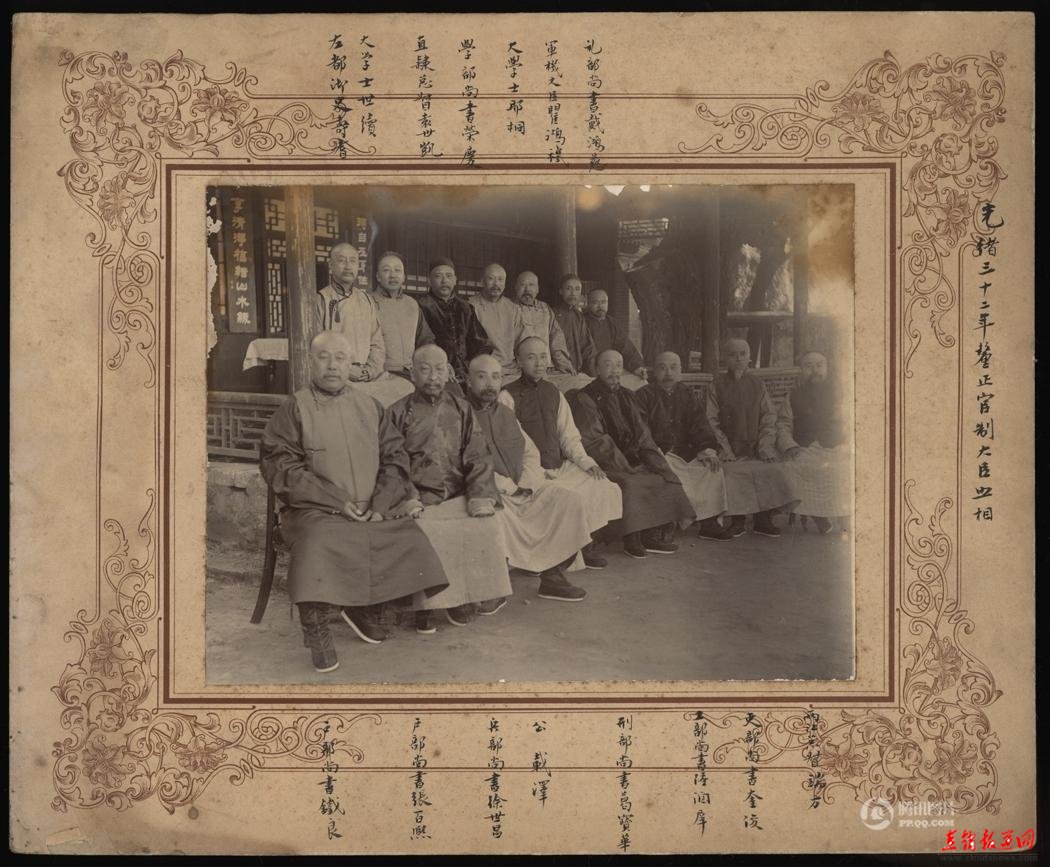 六、部分影像内容罕见,如业已不存的建筑,某些历史名人难得的影像和家族群像,部分晚清至民国初年改革振兴的图景和早期院史照片等等,具有很高的文献和学术价值;七、影像四周和背面的片言只语等文字信息尽量呈现,有助于今人了解相关背景和内容。图为清光绪三十二年厘正官制大臣之相(1906年),清光绪三十二年(1906年),清廷明确宣示预备立宪,“先行厘定官制”,任命载泽、徐世昌、袁世凯等人为官制编纂大臣,此帧即为当时诸人的合影。