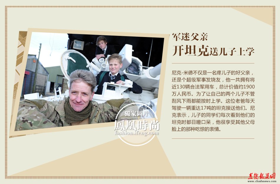 尼克-米德不仅是一名疼儿子的好父亲,还是个军事发烧友,为了让自己的两个儿子不管刮风下雨都能按时上学,这位军迷老爸每天驾驶一辆重达17吨的坦克接送他们。
