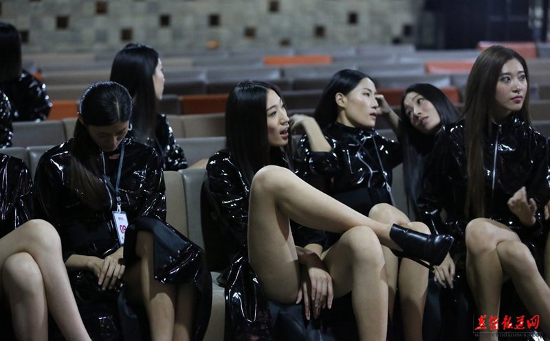 国际模特大赛总决赛彩排举行,俊男靓女选手亮相舞台,一位佳丽台下休息时翘起美腿,手遮私处防偷拍。