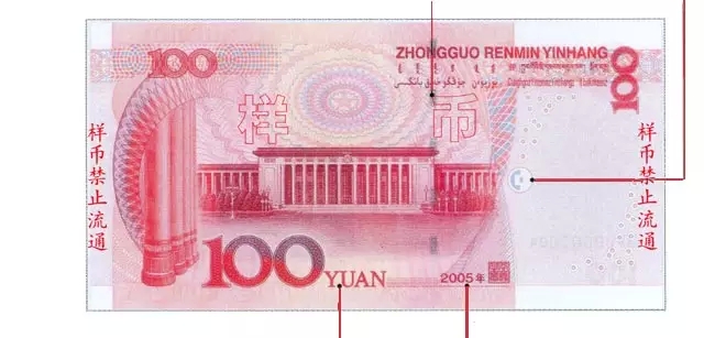 正面图案,票面中部增加光彩光变数字“100”,其下方团花中央花卉图案调整为紫色;取消左下角光变油墨面额数字,调整为胶印对印图案,其上方为双色横号码;正面主景图案右侧增加光变镂空开窗安全线和竖号码;右上角面额数字由横排改为竖排,并对数字样式进行了调整。