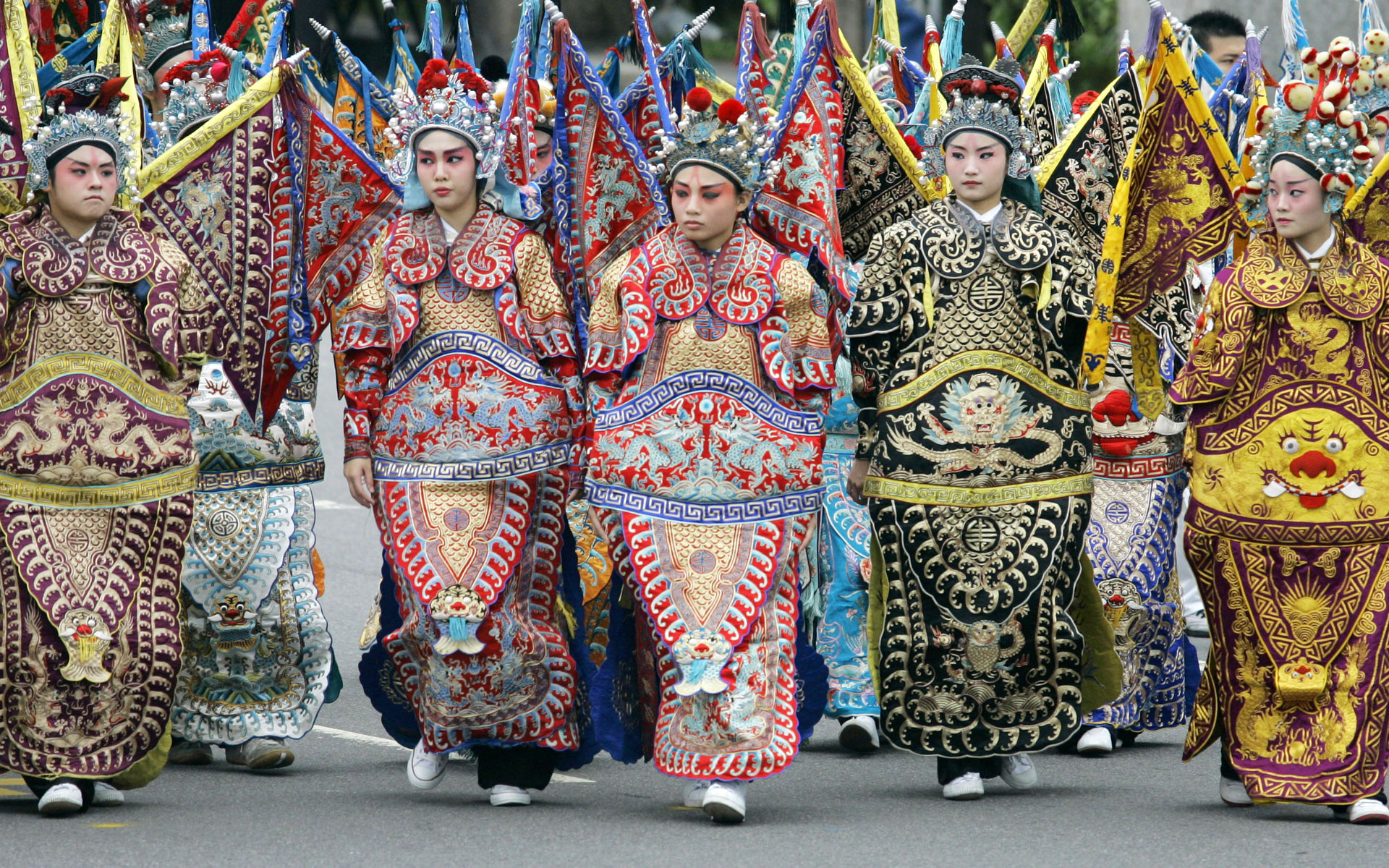 2007年10月10日,台湾阅兵式上,一些舞者身穿戏服参加阅兵游行。