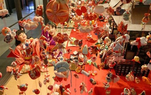 场内,各种挂饰被红线穿起,并从上方垂下,令整个会场洋溢着缤纷华丽的氛围。身着和服的一群小女孩好奇打量着这些挂饰,与周边景象相映成趣。