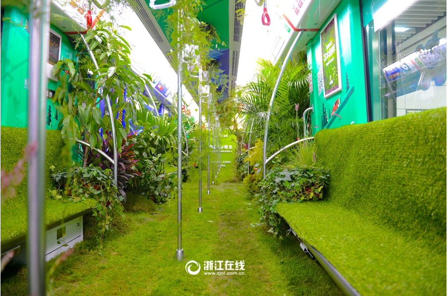 【直报网北京11月29日讯】(人民网)28日,杭州地铁发生了一件大事!杭州地铁一号线的某辆列车竟然把大自然“搬进”了车厢里。一幕幕的绿色植物,带着泥土的气息,仿佛穿越到了世外桃源。将森林种在地铁里,当属国内地铁的首次创意尝试,通过城市森林,共同向人们传递了绿色又低碳的理念。据悉,这辆“森林”列车仅在28日上午对市民开放半天,开放时间如此短,着实让人大呼遗憾。▲ |