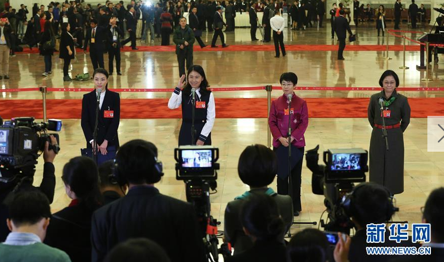 开幕会前,吴敏霞、杜玉涛、蒙曼、卢丽安代表(自左至右)接受采访。