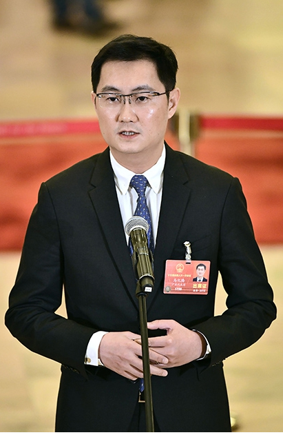 马化腾,全国人大代表、腾讯计算机系统有限公司董事会主席、首席执行官,在“代表通道”接受采访。