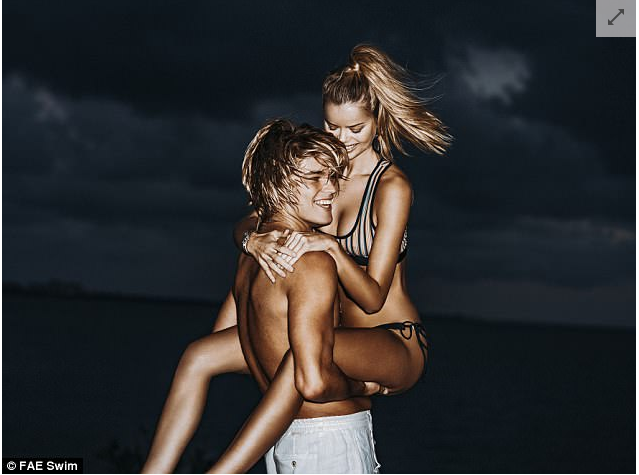 图为Jordan Barrett和Frida Aasen泳装大片,金童玉女十分般配。