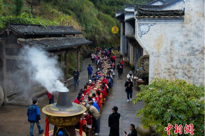 【直报网北京12月28日讯】(中新网)12月22日,农历冬至节气,江西省婺源县篁岭古村举行火锅宴庆祝丰收。高3米、直径2米的巨型紫铜火锅亮相古村,引得众人围观。当日,百米长桌火锅宴将古村的街道排得满满当当,来自新加坡和马来西亚等地的海内外宾客云集与此,共同分享盛宴。 |