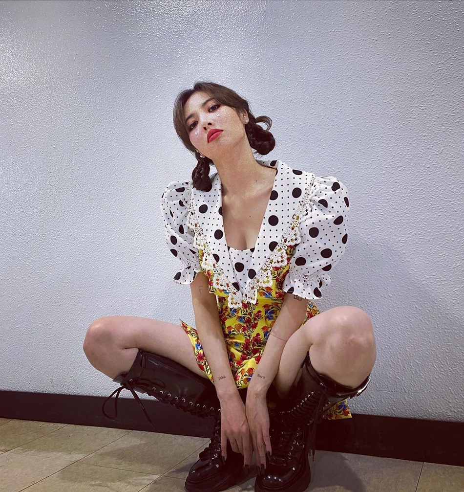 泫雅穿印花短裙晒美照 对镜wink表情丰富俏皮可爱(2)