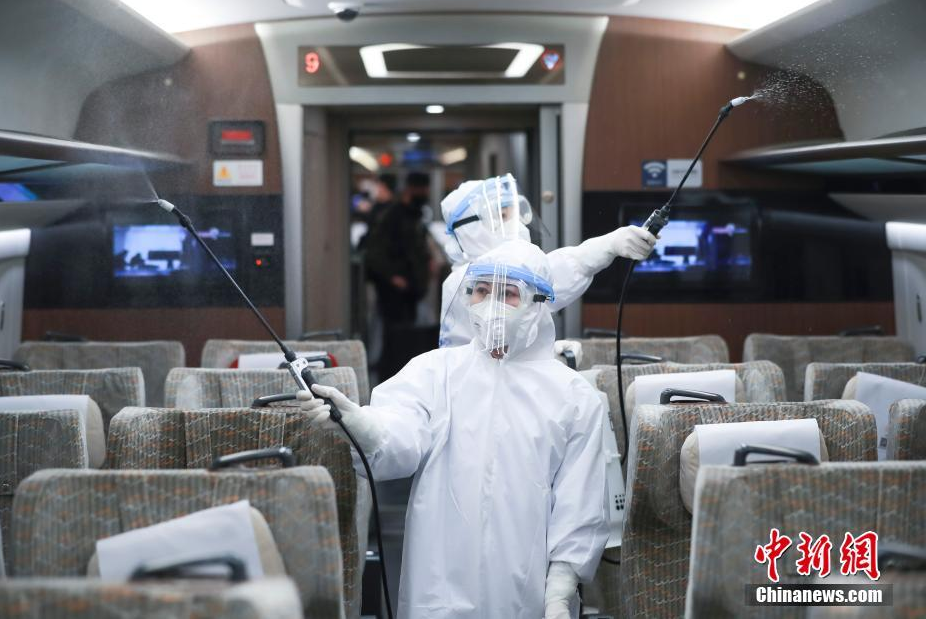 【直报网北京3月12日讯】(新浪图片)在北京三大火车站的战“疫”一线,有一支专业负责消毒的“娘子军”,她们手拎10多公斤的消毒桶,身穿防护隔离服,穿行在车站与列车之间。1月23日,中国铁路北京局集团有限公司北京铁路疾病预防医学研究中心成立了消毒处置组,共有36名成员,其中有23名女消毒手,她们在北京站、北京西站和北京南站担负着从重点地区到京或出现发热旅客等重点车辆的消毒任务。张轩旗、韩秋谨是北京铁路疾病预防医学研究中心护理科采血室的两名护士,她们主动请战加入消毒处置组,在北京西站执行消毒任务。图为二人在一辆高铁车厢内执行消毒任务。中新社记者 贾天勇 摄 |