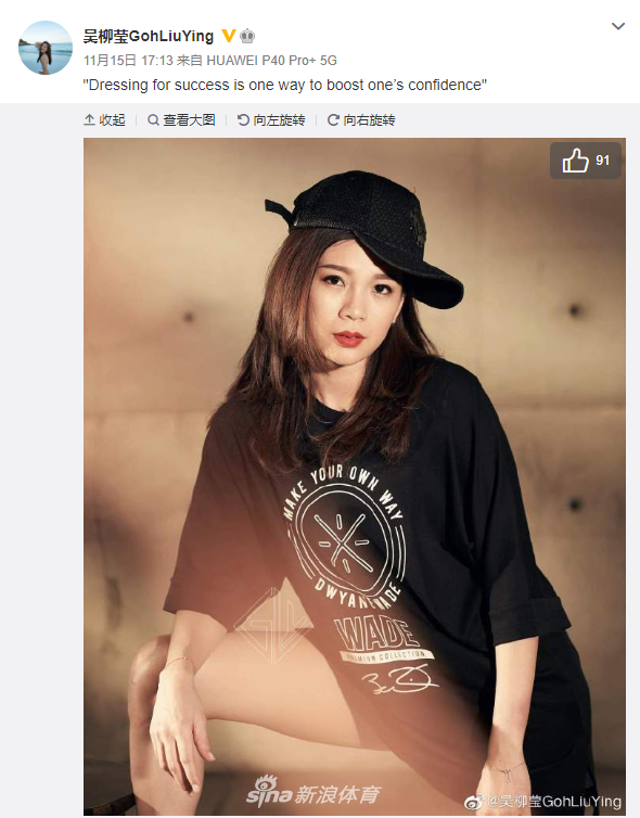 【直报网北京11月16日讯】(新浪图片)2020年11月15日,马来西亚国家羽毛球队女运动员吴柳莹在微博晒美拍并配文:"Dressing for success is one way to boost one’s confidence." |