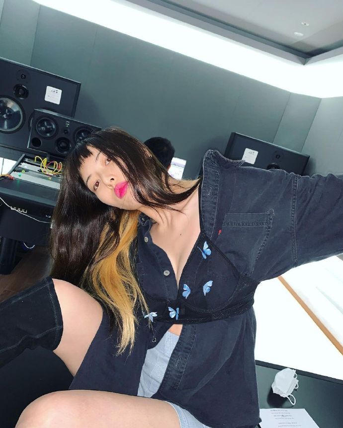 泫雅穿抹胸搭男友风牛仔衣(3)