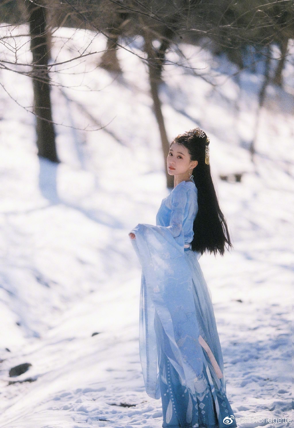 乔欣分享古装写真大片 穿蓝衣雪地中手持团扇仙气十足(2)