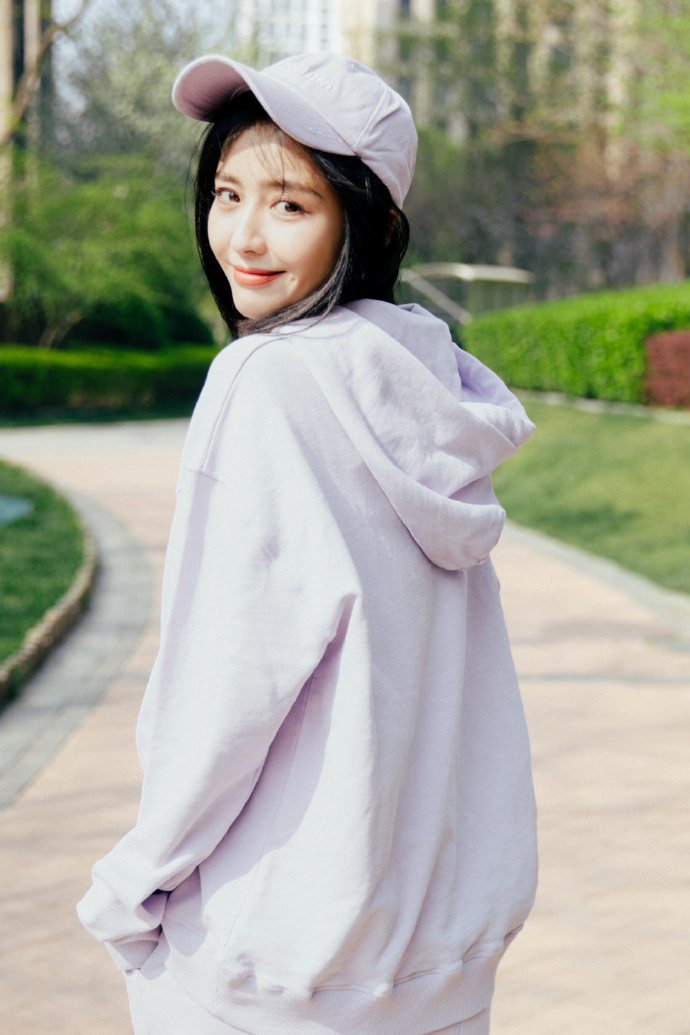 佟丽娅晒春日下班图 穿浅紫色卫衣阳光下回眸灿笑(2)
