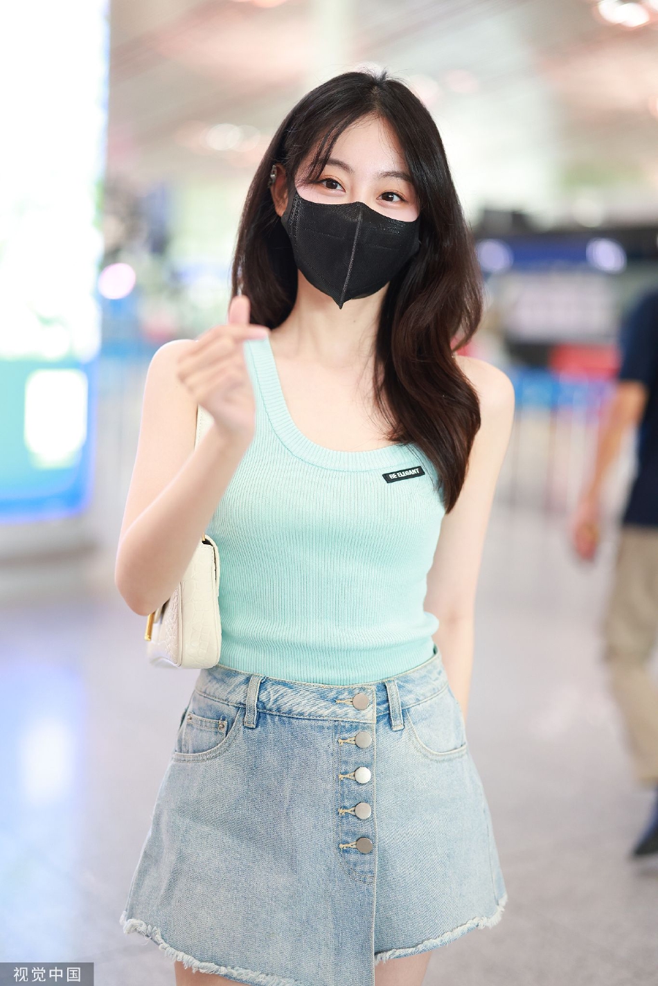 祝绪丹穿绿色背心现身机场 搭配牛仔超短裙清新养眼(3)