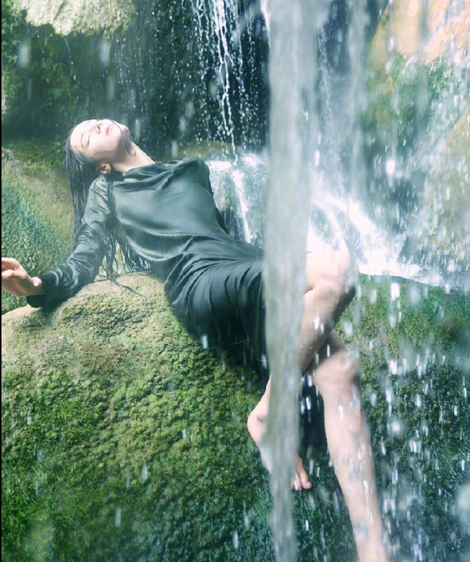 迪丽热巴听瀑大片梦幻十足 长发及腰展现自然野性之美(3)