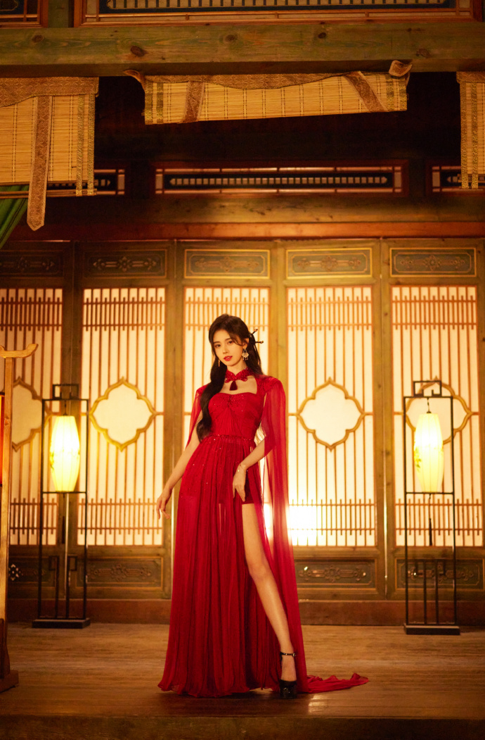 鞠婧祎穿红色露背抹胸裙秀长腿 一抹烈焰红唇魅惑又俏皮(6)