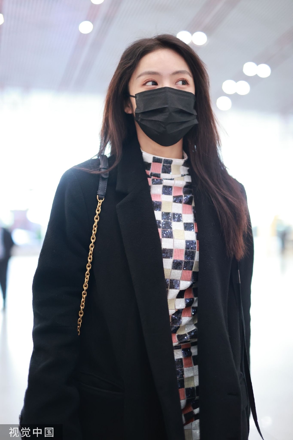 蔡文静黑色长大衣造型现身机场 温柔披发气质温柔大方(8)