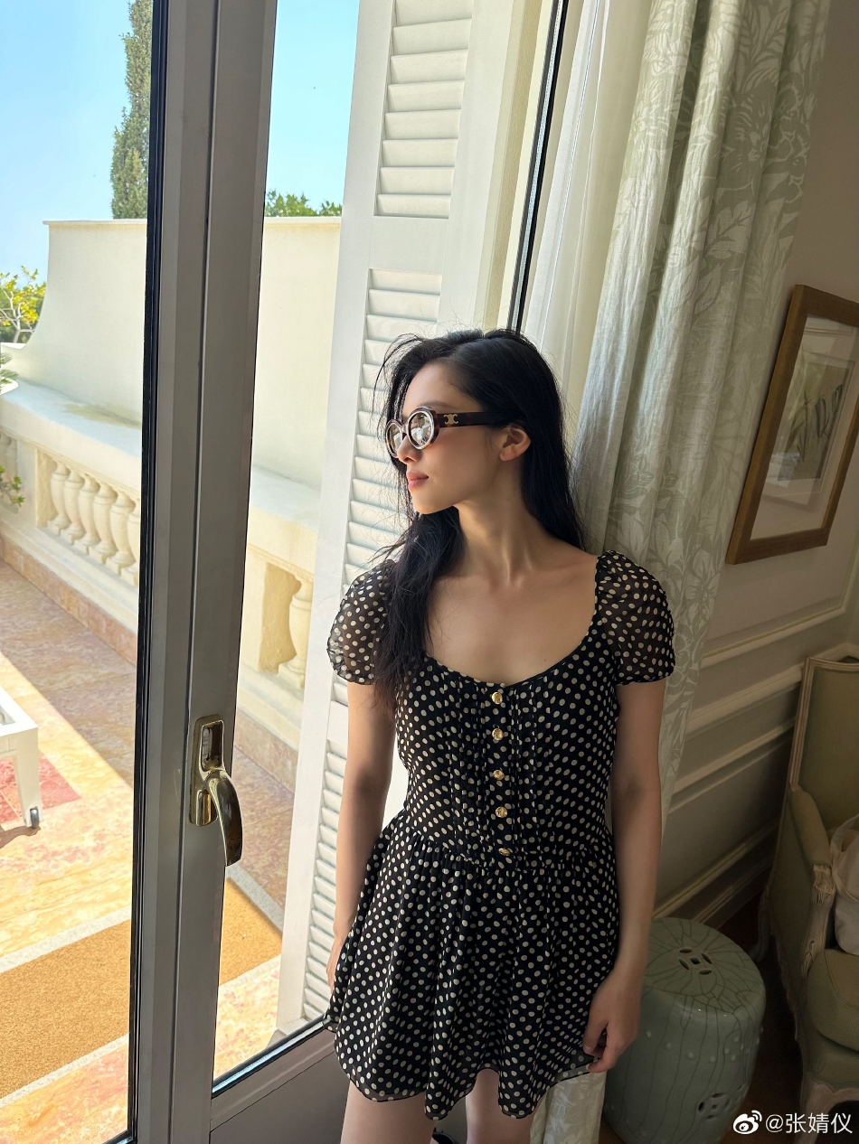 张婧仪戛纳游玩九宫格随拍 穿黑色波点短裙秀美腿(2)