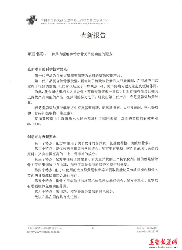 【直报网6月11日讯】(春芝堂)6月9日,中国中医药文献检索中心给春芝堂蓝加黄胶囊下发科技查新报告(报告编号:QQ14048)。报告指出,春芝堂蓝加黄胶囊有6点符合创新要求,故该产品在国内具有先进性。蓝加黄胶囊的创新点具体如下: 第一个特点:配方中重用了关节软骨的营养素——氨基葡萄糖、硫酸软骨素。 第二个特点:现代医药与祖国医学的结合。配方中有氨糖、软骨素是现代医药的原料,又有祖国医药的三七、骨碎补的成分。 第三个特点:配方中使用了维生素C和大豆异黄酮两个抗氧化剂,目的就是清除骨关节组织细胞中的自由基,加强了对骨关节的保护和损伤的修复。 第四个特点:配方中使用的大豆异黄酮和骨碎补提取物能使关节软骨损伤和骨关节面的骨质疏松相结合进行治疗。 第五个特点:将骨关节病治疗与增强机体免疫功能相结合。配方中三七、氨糖均有增强机体免疫功能作用。 第六个特点:采用动、植物提取分离出的绿色成分。 附:查新报告是查新机构根据查新项目的查新点与所查数据库等范围内的文献信息进行比较分析,对查新点作出判别,以书面形式撰写的客观、公正性的技术文件。其目的是为科研立项、成果评价、新产品鉴定等提供客观的文献依据。▲ (原标题:春芝堂蓝加黄胶囊符合创新要求 具有先进性) 责任编辑:小申 |