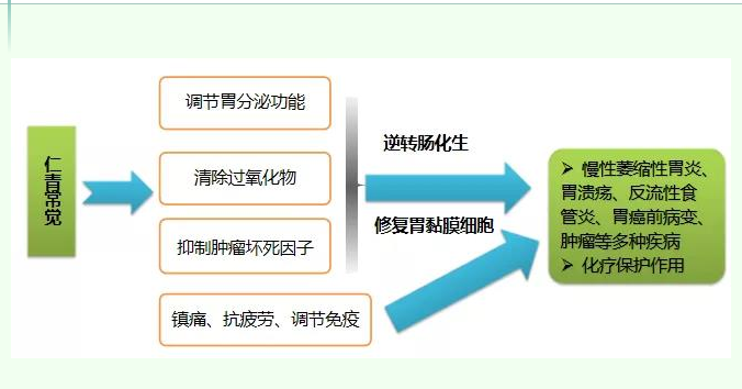 通过动物试验证实,仁青常觉具有镇痛、抗疲劳作用,并且能够增强脾虚小鼠免疫功能等药理作用;仁青常觉可以调节T细胞亚群比例及促进IL-2、IL-6、IFN-γ、NKC等细胞因子的分泌,能提高机体免疫。 据现代医学文献报道,方中檀香、降香、沉香具有行气温中、开胃止痛之效。仁青常觉可以调理人体脏腑功能,具有增强免疫力的作用。也是治疗急慢性胃炎(包括慢性浅表性胃炎、慢性萎缩性胃炎),消化系统溃疡(包括胃及十二指肠溃疡),慢性溃疡性结肠炎等疾病的常用藏药。通过动物实验表明仁青常觉具有镇痛、抗疲劳、提高免疫力等作用并且能够增强脾虚小鼠免疫功能。研究表明仁青常觉可用于治疗萎缩性胃炎、胃溃疡等消化系统疾病。 仁青常觉被列入国家医保(2017年版)乙类目录,上市销售以来获得千万患者对其疗效的认可! 参考文献: 1、孙鹏,付琼玲,薛玲.仁青常觉镇痛、抗疲劳、免疫作用药理研究[J].山东中医药大学学报,2014,38(04):400-402. 2、调理脏腑之王,仁青常觉[J]. 家庭医药, 2010(12):37-37. 3、李莉,赵军宁,宋军,等.仁青常觉抗胃溃疡作用研究[J].中药药理与临床.2008.23(6):5-7.