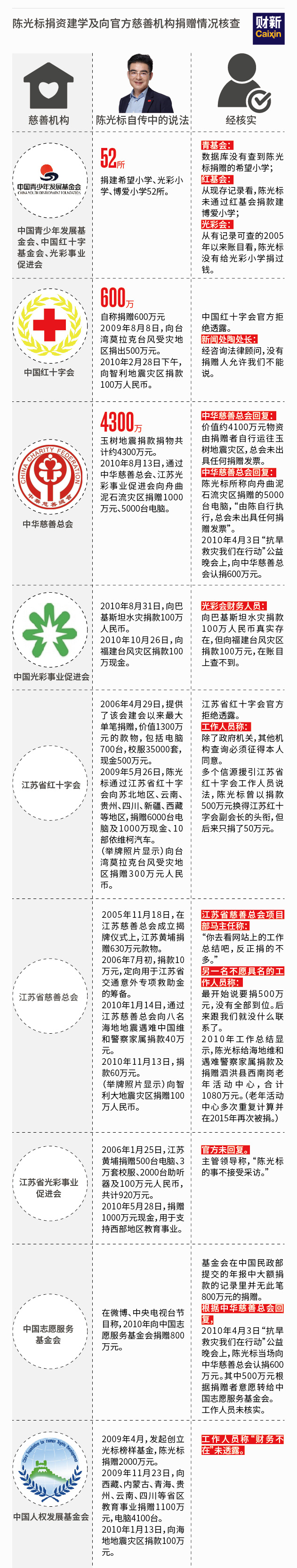 有账目可查的慈善:水分为主 公开资料显示,陈光标现年48岁,对外称祖籍安徽省五河县,出生于江苏省泗洪县天岗湖乡。陈光标曾自称其30岁(1998年)担任南京金威利电子医疗器械公司董事长时,即开始慈善事业,“截止到2012年7月,捐款总额超过了20亿元,帮助特困户逾70万”。而一位自称熟悉陈光标捐款历史的人士告诉财新记者,“陈光标这些年自己出钱的所有捐赠加在一起也就两三千万”。 捐款两三千万元并不是个小数目,但“两三千万”与“20亿”相差近100倍,水分有这么大吗? 2011年1月,陈光标通过《公益时报》首次向公众公布了他的2010年捐款明细,自称2010年为慈善和公益事业捐款再次超过3亿元。明细公布之后,公众对陈光标捐款真实性的质疑一直没有停止。为此,财新记者对照陈光标自述的捐款事实,逐项进行了核实。 根据陈光标口述的自传《高调的中国首善——陈光标传》(下称《自传》)梳理,陈光标的慈善捐赠包括四部分:捐资建学校、向官方慈善机构捐赠、自行发放现金、捐建公共设施。但是经财新调查,陈光标捐资建学校几乎不存在;给官方慈善机构的捐赠,很多进行了重复计算,或者由其自行执行,慈善机构拒绝为其出具发票背书;他多次直接发放现金的公开作秀,实质金额大量注水,而且涉嫌违法募资;而他号称捐建的公共设施,经财新记者查证,曾经或一直为其自用并牟利。 捐资建学校及向官方慈善机构捐赠,这两个渠道均有官方慈善机构的账目可以查询。陈光标《自传》中提到的相关捐赠如下表所示。 ![]()