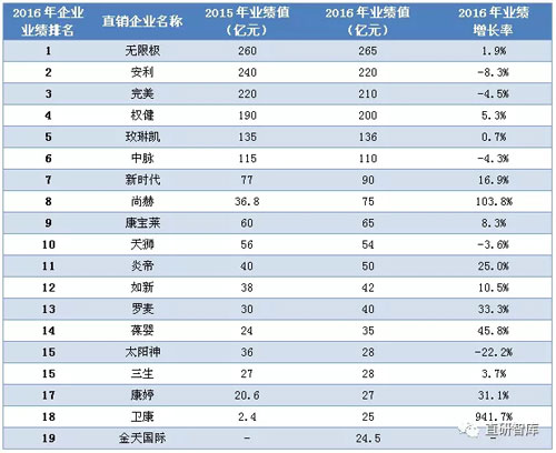 【直报网北京2月16日讯】2016年,我国经济增速放缓,产业结构调整;政策法规持续完善,直销环境逐渐规范;商务部放牌数量增多,企业竞争加剧。2016年注定是不平凡的一年,将在我国直销历史上记录下浓墨重彩的一笔,世界直销研究院通过企业调研、企业公告以及自身资源获取到2016年我国直销企业业绩,现正式发布,以供业界参考。 2016年在我国开展直销业务的78家直销企业业绩总和为2092.1亿元,较2015年的1906.3亿元增长了9.7%。2016年直销行业业绩前十企业名单与2015年变化不大,无限极以265亿元的业绩继续领跑行业;安利、完美业绩均有下滑,但仍然进入前三;权健和玫琳凯持续增长分别位居第四名和第五名;中脉和新时代保持行业第六和第七;尚赫以103.8%的业绩增长率进入榜单并超越康宝莱和天狮居第八名。 图表 1 2016年我国直销企业业绩排名 ![]()