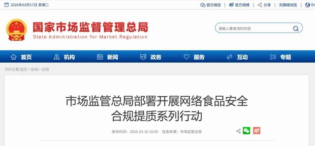 行动期间,将针对直播带货食品、网售食品、保健食品、网红食品等突出问题开展专项整治,加大对假冒伪劣、以次充好等问题食品的监管执法力度,推动网络交易平台联合签署自律公约,强化跨区域、线上线下协同监管,实现食品安全源头可追、风险可溯。市场监管总局将以最严格的监管,督促平台企业增强合规管理能力、提升质量安全水平,营造安全放心的网络食品消费环境,全力守护人民群众“舌尖上的安全”。 (原标题:涉直播带货和保健食品 市场监管总局三严政策) 责任编辑:一一 【特别声明:部分文字及图片来源于网络,仅供学习和交流使用,不具有任何商业用途,其目的在于传递更多的信息,并不代表本平台赞同其观点。版权归原作者所有,如涉版权或来源标注有误,请及时和我们取得联系,我们将迅速处理,谢谢!】 解读新闻热点、呈现敏感事件、更多独家分析,尽在以下微信公号,扫描二维码免费阅读。