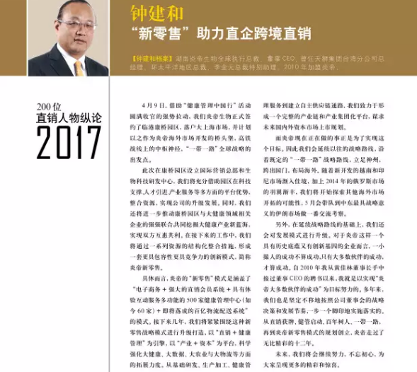 钟建和 “新零售”助力直企跨境直销 【直报网北京8月14日讯】(营讯传媒)4月9日,借助“健康管理中国行”活动圆满收官的强势拉动,我们炎帝生物正式签约了临港康桥园区,落户大上海市场,并计划以之作为炎帝海外市场开发的桥头堡,高铁战线上的中枢神经,“一带一路”全球战略的出发点。 此次在康桥园区设立国际营销总部和生物科技研发中心,我们将充分借助园区在科技支撑、人才引进、产业服务等多方面的平台优势,整合资源,实现公司的升级发展。同时,我们还将进一步推动康桥园区与大健康领域相关企业的强强联合,共同挖掘大健康产业新蓝海,实现双方互惠共利。在接下来的工作中,我们将通过一系列资源的结构化整合措施,形成一套更具包容性更具竞争力的创新模式,简称炎帝新零售。 具体而言,炎帝的“新零售”模式是涵盖了“电子商务+强大的直销会员系统+具有体验互动服务多功能的500家健康管理中心(如今60家)+即将落成的百亿物流配送系统”的模式。接下来几年,我们将紧紧围绕这种新零售战略模式进行升级打造,以“直销+健康管理”为引擎,以“产业+资本”为平台,科学强化大健康、大数据、大农业与大物流等方面的拓展力度。从基础研发、生产加工、健康管理服务到建立自主供应链通路,我们致力于形成一个完整的产业链和产业集团化平台,谋求未来国内外资本市场上市规划。
