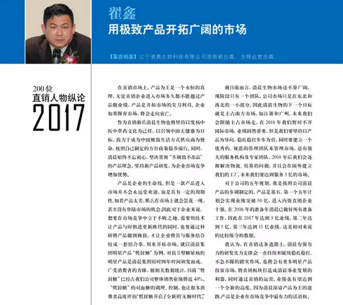 翟鑫 用极致产品开拓广阔的市场 【直报网北京8月14日讯】(营讯传媒)在直销市场上,产品为王是一个永恒的真理,无论直销企业进入市场多久都不能越过产品做业绩,产品是开拓市场的尖刀利刃。企业如果摒弃市场,将会走向衰亡。 作为直销新兵清晨生物也将坚持以发扬中医中草药文化为己任,以引领中国大健康为目标,致力于成为中国极致生活方式供应商为使命,按照自己制定的方针政策稳步前行。同时,清晨始终不忘初心,坚决贯彻“不极致不出品”的产品理念,坚持新产品研发,为企业市场竞争增加优势。 产品是企业的生命线,但是一款产品进入市场并不会永远受欢迎,而是具有一定的周期性,如若产品太差,那么在市场上就会昙花一现,甚至没有登陆市场的机会。因此对于企业来说,想要在市场竞争中立于不败之地,需要用技术让产品与时俱进更新换代的同时,也要通过科研将产品做到极致,才让企业将其与服务结合组成一套组合拳,用来开拓市场。就以清晨集团明星产品“臂封糖”为例,对抗Ⅱ型糖尿病的明星产品是清晨集团历时四年时间研发而成,广受消费者的青睐,据相关数据统计,目前“臂封糖”已经占我们公司整体销售业绩将近40%。“臂封糖”的对血糖的调理、控制,也让很多消费者高度评价:“臂封糖开启了全新的‘无糖时代’。” ![]() 就目前而言,清晨生物市场还不算广阔,现阶段只有一个团队,公司市场只是在东北和西北的一小部分,因此清晨生物的下一个目标就是主占南方市场,如江浙和广州,未来我们会跟随主占市场走,在2018年我们暂时不开国际市场,业绩固然重要,但是我们要坚持以产品为导向,稳扎稳打步步为营,同时要建立一个优秀的、规范的管理团队来管理市场,还有强大的服务机构及专家团队,2018年后我们会逐渐解决物流、结算的问题,并且会在国外建立我们的工厂,未来我们要达到服务3亿的市场。 对于公司的五年规划,我是按照公司清晨产品的步调制定的,产品是基石,第一个五年计划会实现业绩突破50亿,进入内资直销企业十强。在2016年的准备年清晨已做好所有准备工作,因此在2017年达到3亿业绩,第二年达到5亿,第三年达到15亿业绩,这是相对来说的比较保守的数据。