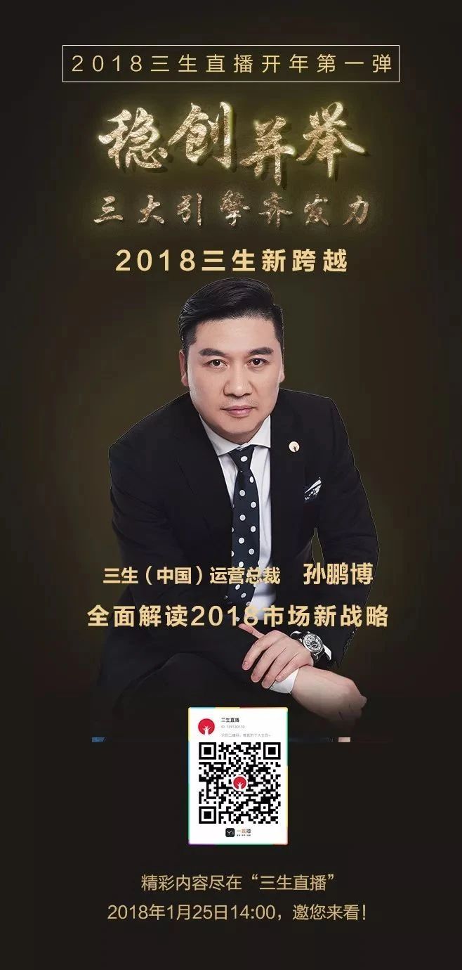 “我认为,创业本身就是无中生有,就是一个从无到有的过程,是一种人生观和人生态度。” 孙鹏博一开口常常就语出惊人。 创业的核心是经济,因此我们需要对大的经济形势有所了解。为什么很多人创业不成功?因为他们对大的发展方向和经济环境不了解。据统计,目前,服务业已占据中国经济的60%以上。所以现在中国创业,最好的是做什么呢?消费者领域!特别是衣食住行这些与消费者生活息息相关的行业。三生公司目前也在做这样的领域。这些年,三生公司就做了一件事,那就是顺势而为。当你们做顺势而为的事情时,事情就变得比较简单。我们想想,顺风跑是多么幸福,逆风跑是多么困难!所以,我认为创业需要抓住这个消费引擎。过去,我们创业解决的就是消费者的基本生活需求,比如有好的衣服穿,有好的房子住,有好的车开。但是,未来人们所追求的更多是精神层面的东西和健康保健。创业者如果选择这两类产业,也更容易成功。 2018年1月25日,在全新的三生直播间里,三生开启了2018开年第一弹直播:三生(中国)运营总裁孙鹏博做客三生直播间,和广大网友一起畅谈中国大经济趋势和直销发展机遇,以及为大家全面解析2018三生市场节奏规划和利好业务政策。本次直播又创新高,截止直播结束累计观看385万人次,同时最高观看峰值高达48万人次。