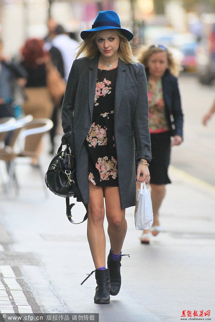 菲妮-科顿 菲妮-科顿(Fearne Cotton)以团状印花短裙搭配灰色大衣完成主要造型,黑色提包与及踝靴酷帅十足,湖蓝色窄檐礼貌则是点睛之笔。