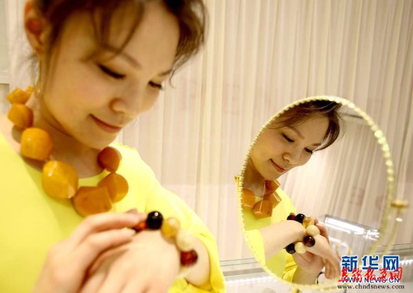 【直报网3月13日讯】(新华网)3月12日,一位顾客在试戴琥珀首饰。当日,“凝固的时光——琥珀盒子文化巡展”在北京百盛购物中心拉开帷幕,展览展出了100多件来自波兰的琥珀精品。▲