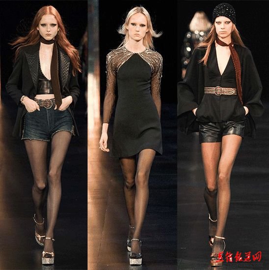 暗黑系摇滚 那些黑色系,充满着七十年代的摇滚平底木屐和靴子,痴迷于蓬松乱发烟熏妆的复古咖。Tom Ford设计的紧身长裤套装,裂开的短裙透出的丝袜边缘,迷你长袖上衣一开着怀,还有充满着挑逗暗示的换进透视上装和珠片黑色绑带晚礼服。Lanvin用黑色刺绣、蕾丝、金属与珍珠镶嵌谱写出暗黑系的奢华摇滚风格。Saint Laurent的礼帽、麂皮夹克、皮裤、丝绒等必备潮品在低胸与大长腿的衬托下显得格外迷人。高腰喇叭裤、牛仔、钉珠腰带、豹纹、闪亮元素与皮草等元素是骨子里自由不羁的嬉皮情怀最直接表现。 |