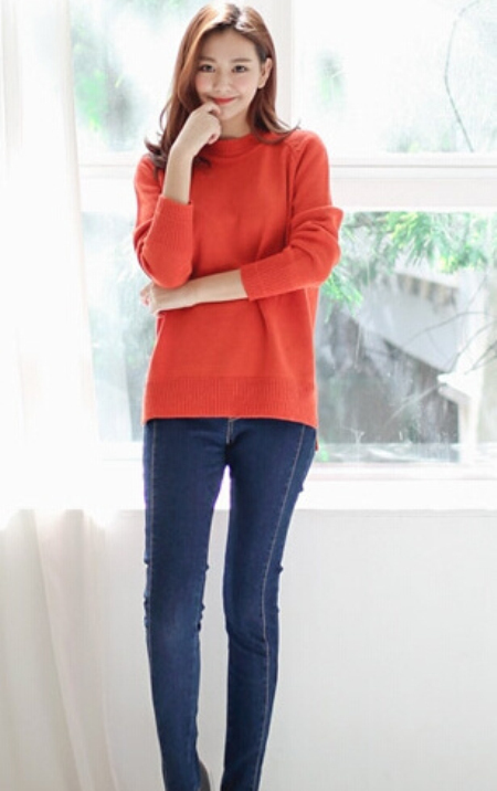 橙红色毛衣让人眼前一亮,看着很提神吧,也格外显肤白,搭配小脚牛仔裤和休闲鞋,舒适大方,出游逛街这样穿又美又不累。