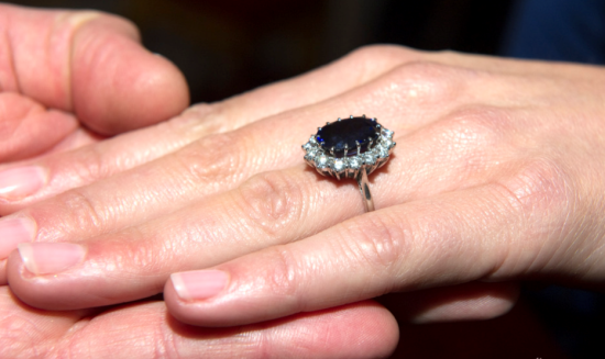 这枚硕大的蓝宝石戒指正是凯特王妃的婚戒,原是威廉王子的母亲戴安娜王妃生前最喜爱的一枚戒指。戴妃去世后,这枚戒指也被威廉王子收藏起来了,直到求婚的时候,他才再次拿出来。