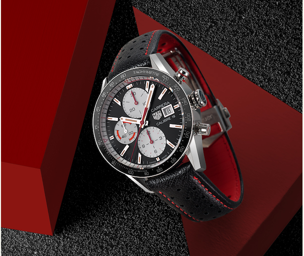 泰格豪雅卡莱拉系列Calibre 16计时码表黑色款 两款带有复古风格的全新卡莱拉系列Calibre16计时码表,表盘直径41毫米,黑色表款搭配黑色皮表带,蓝色表款搭配精钢表链。无论是红色点缀、整体配色、还是对比效果以及各个计时盘的位置都清晰呼应赛车运动。 |
